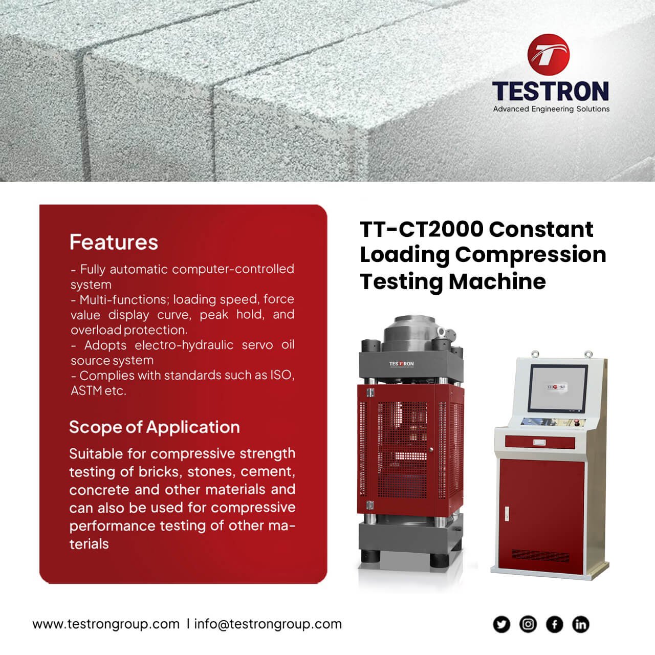 It is suitable for compressive strength testing of bricks, stones, cement, concrete and other materials and can also be used for compressive performance testing of other materials