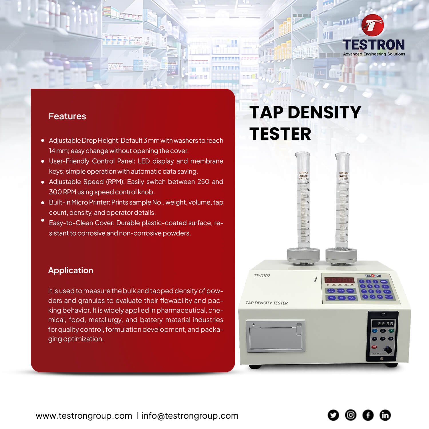 It is used to measure the bulk and tapped density of powders and granules to evaluate their flowability and packing behavior. It is widely applied in pharmaceutical, chemical, food, metallurgy, and battery material industries for quality control, formulation development, and packaging optimization.