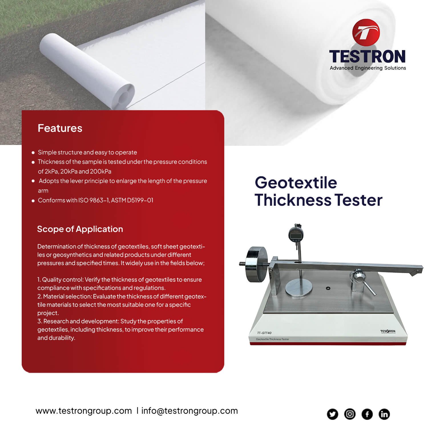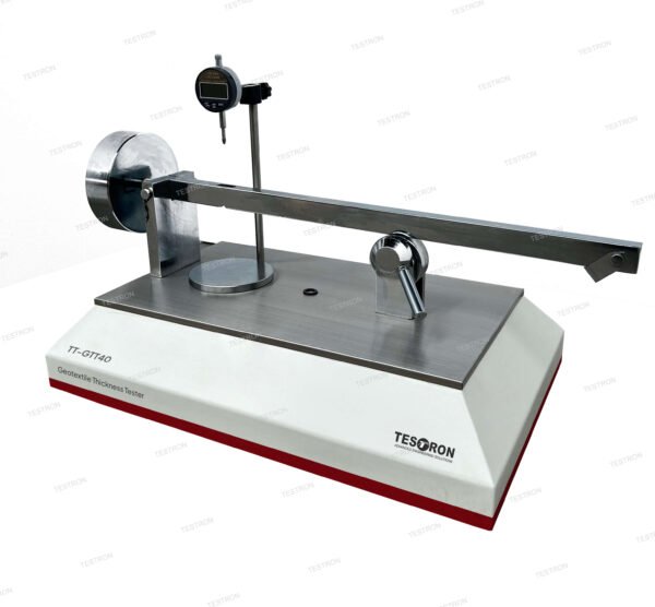 TESTRON TT-GTT40 Geotextile Thickness Tester adopts the lever principle to enlarge the length of the pressure arm. Under the condition of limited space and limited weight quality, the thickness of the sample is tested under the pressure conditions of 2kPa, 20kPa and 200kPa. The instrument is simple in structure and easy to operate. It is the first choice for production and verification of geotextile and geomembrane thickness.