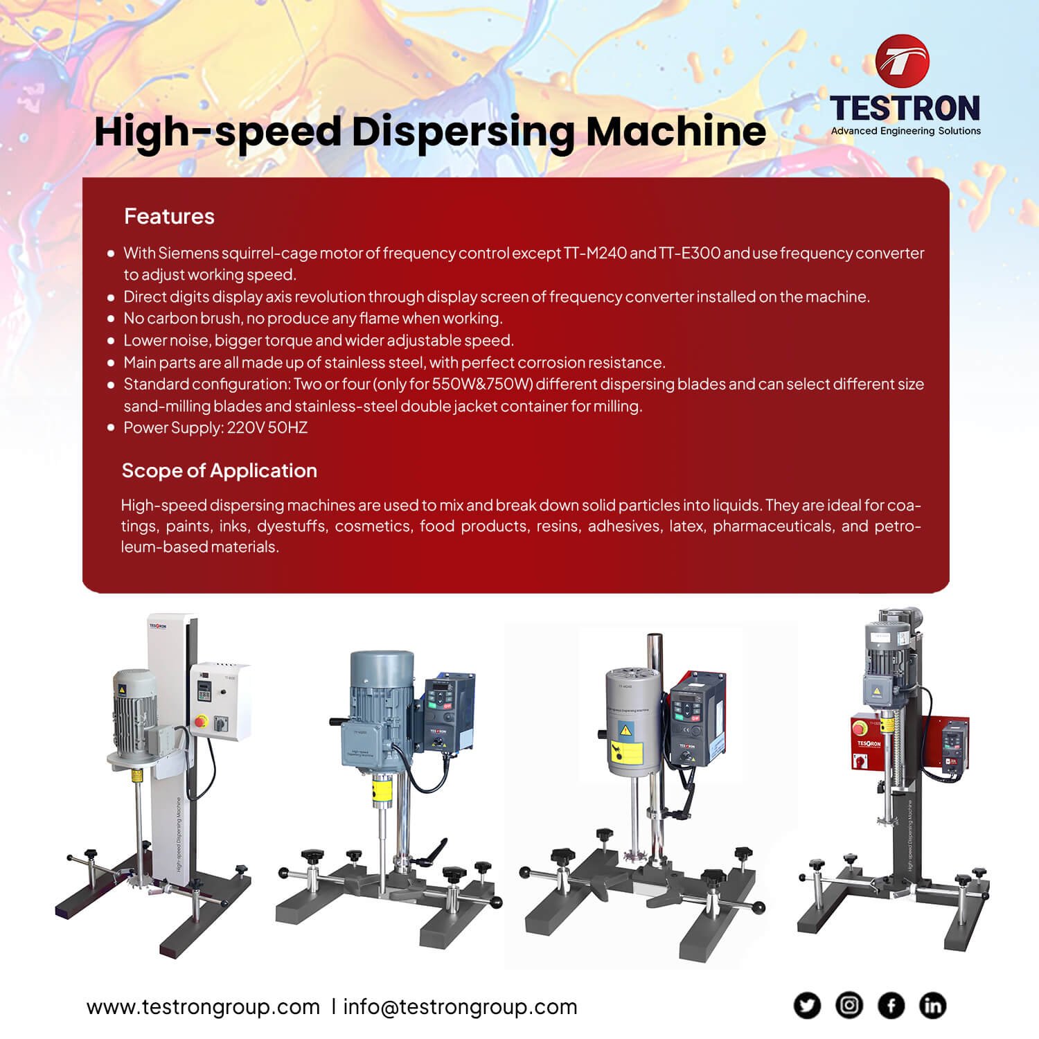 High-speed dispersing machines are used to mix and break down solid particles into liquids. They are ideal for coatings, paints, inks, dyestuffs, cosmetics, food products, resins, adhesives, latex, pharmaceuticals, and petroleum-based materials.